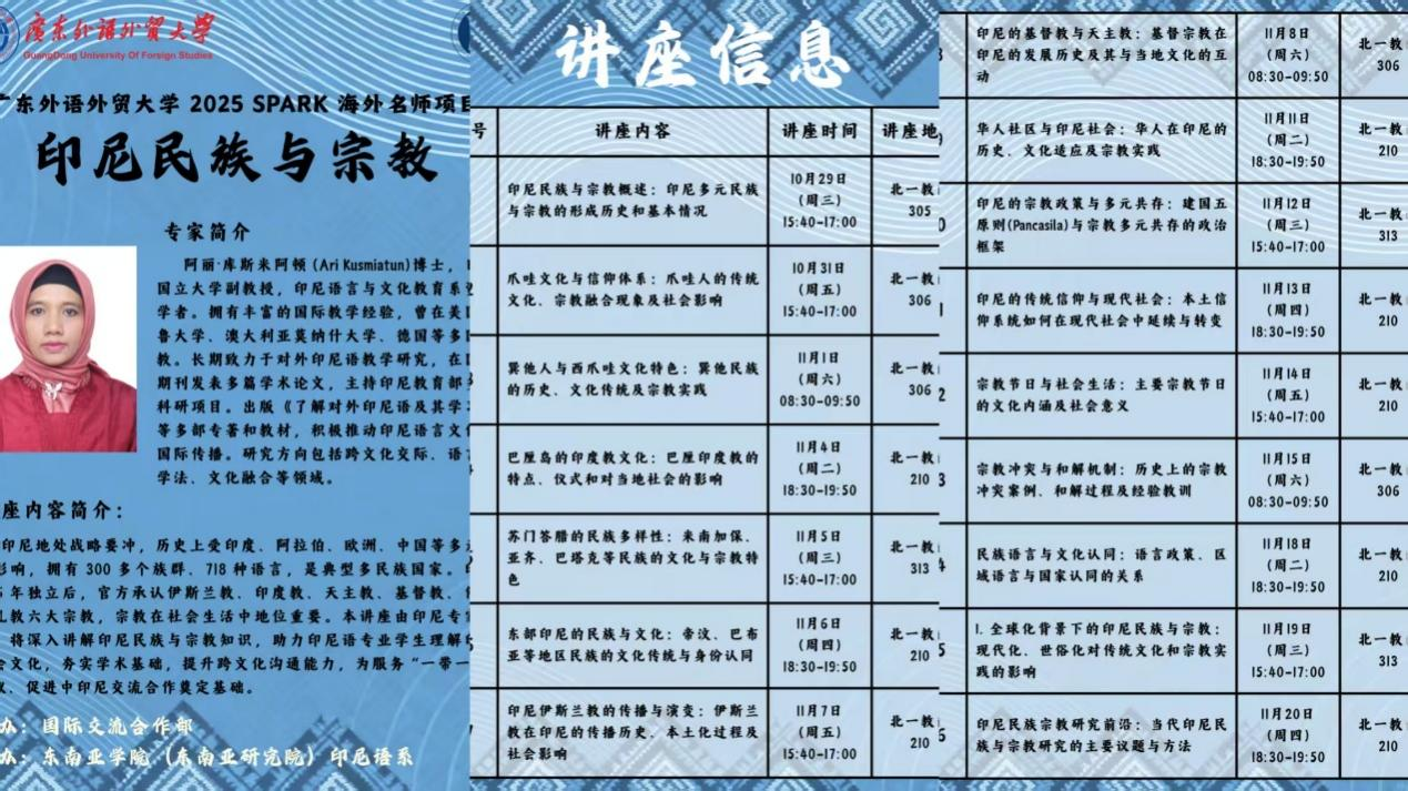 本网讯 2025年10月31日至11月20日,由东南亚学院(东南亚研究院)印尼语系承办的“海外名师项目”SPARK《印尼民族与宗教》系列讲座成功举办,为期三周的学术盛宴为师生们打开了一扇深入了解印尼社会文化的窗口。印尼作为世界上最大的群岛国家,地处亚太战略要冲,是一个极具文化多样性的国度。这片土地上生活着300多个族群,使用着718种语言,堪称世界民族文化的“万花筒”。在漫长的历史长河中,印尼先后受到印度文明、阿拉...