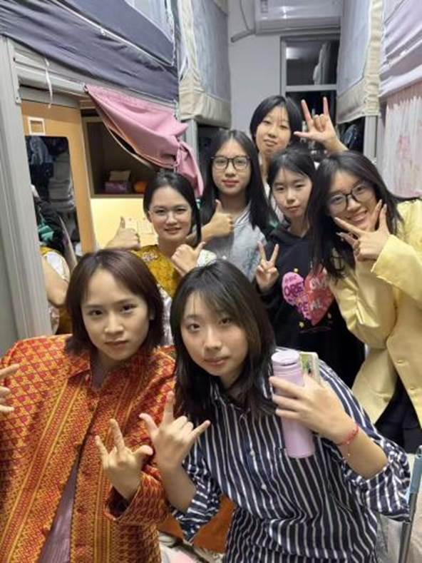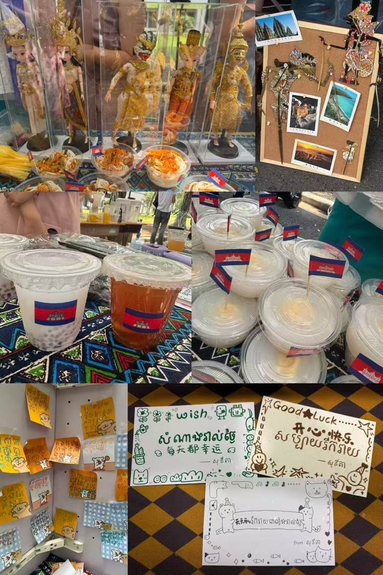 在集体活动中,我们以“文化”为纽带凝聚力量。为迎接新生,全班同学共同排练柬埔寨特色短剧,从剧本打磨到道具制作,每个人都主动分担、默契配合,用精彩演出传递温暖与欢迎;在东南亚风情文化节中,我们不仅携手编排了柬埔寨传统舞蹈,以优美舞姿展现文化魅力,还共同经营柬埔寨特色摊位,从食材采购到现场售卖,分工明确、互帮互助,让团队协作的力量在实践中充分彰显。