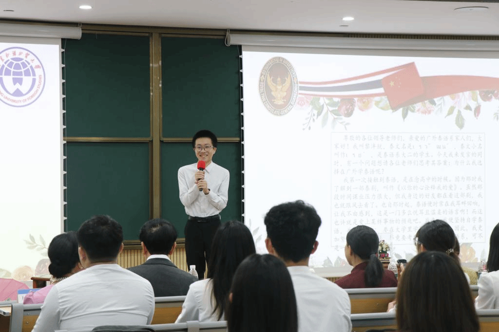 本网讯 2023年9月14日上午,2023年度泰国总领事奖学金授予仪式在广东外语外贸大学北校区第一教学楼109阶梯课室举行。泰王国驻广州总领事馆总领事吉拉蓬·素妲尼阁下、泰王国驻广州总领事馆副总领事常佩瑶女士、泰王国驻广州总领事馆领事王水清女士、泰王国驻广州总领事馆领事吴盈如女士、泰王国驻广州总领事馆领事林跃文女士、我校东方语言文化学院党委书记郝建萍及泰语系师生代表出席了本次活动。