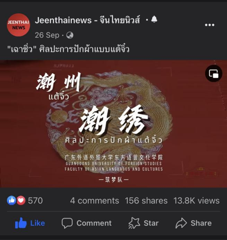 我校东语学生实践团队立足学校专业优势,将专业和实践充分结合,利用新媒体平台,创新网络媒体的内容和形式,结合国家对非物质文化遗产保护和传承工作、做好“侨”文章的国家战略,借助多语言,拓宽非遗文化赋能潮绣艺术、茶副产品的宣传推广渠道,助力潮汕非遗文化的海内外传播。东语学子学以致用,用所学加强非物质文化遗产的保护、传承和创新发展,探索非遗发展新路径,为助力侨乡经济建设奉献自己的青春力量。