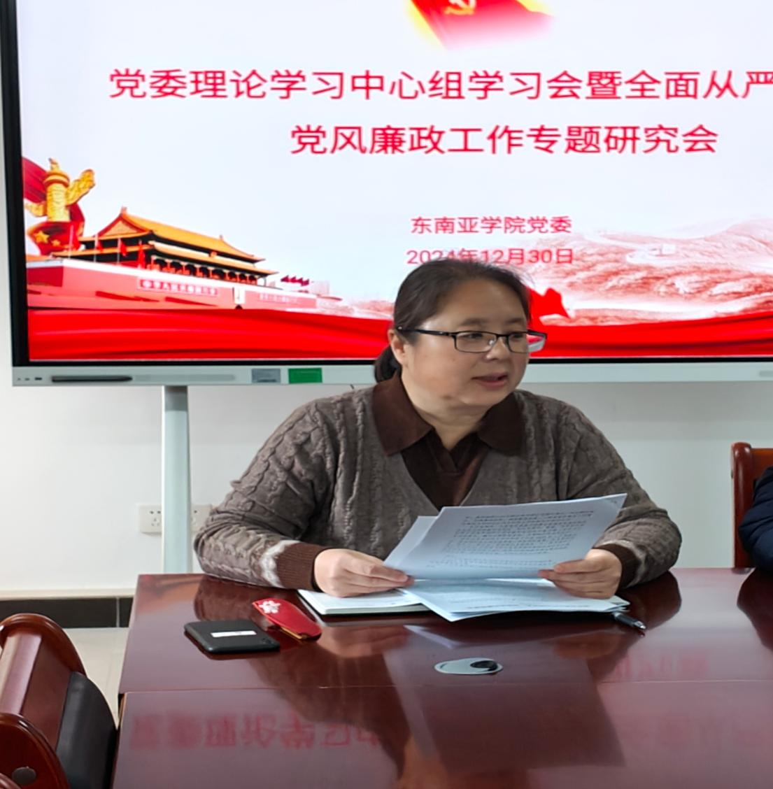 本网讯 12月30日上午,东南亚学院党委召开理论学习中心组学习会暨全面从严治党工作、党风廉政建设工作专题研究会。学院党委委员、党政领导班子成员参加会议,会议由郝建萍书记主持。
