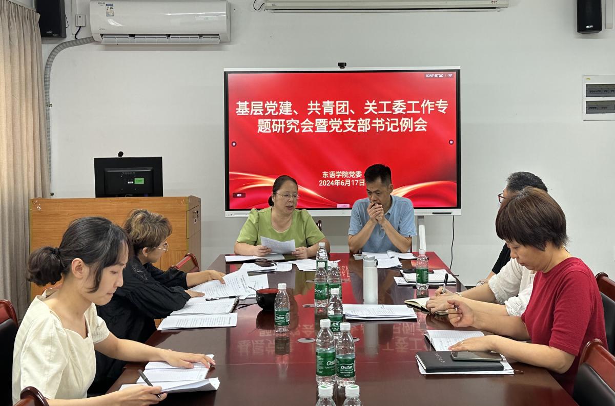 (本网讯)6月17日下午,东语学院党委召开基层党建、共青团、关工委工作专题研究会暨党支部书记例会。学院党政领导班子、党委委员、组织员、辅导员参加会议。会议由学院党委书记郝建萍主持。