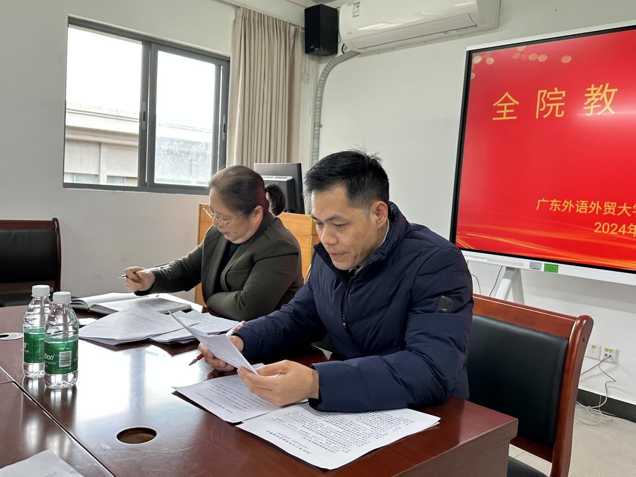 刘志强院长进行新学期工作布置。刘志强回顾2023年我院各项事业发展和取得的成绩,指出学院事业取得的各项进步与成绩都是我院全体教职员工积极努力、不断拼搏的结果。结合2024年学校发展战略研讨会校长和书记的报告,刘志强指出,过去五年,国际国内形势发生巨变,科技进步日新月异,高等教育格局经历结构性重构,外语院校的时代红利在逐步消解,重大颠覆性技术变革的冲击已在眼前,学院挑战与机遇并存。新学期,学院要继续在推动人才引进、加强学科专业间交叉融合,促进学科专业发展,做好学生出国交换,提升国际交流水平,搭建科研创新平台,提高服务社会水平等方面狠下功夫。老师们要坚定信心,鼓足干劲,振奋精神,以“咬定青山不放松”的韧劲,“越是艰险越向前”的勇气,“不待扬鞭自奋蹄”的自觉去拼搏,以更加高昂的斗志和更加务实的行动回答好“强国建设 广外何为”的时代问卷!