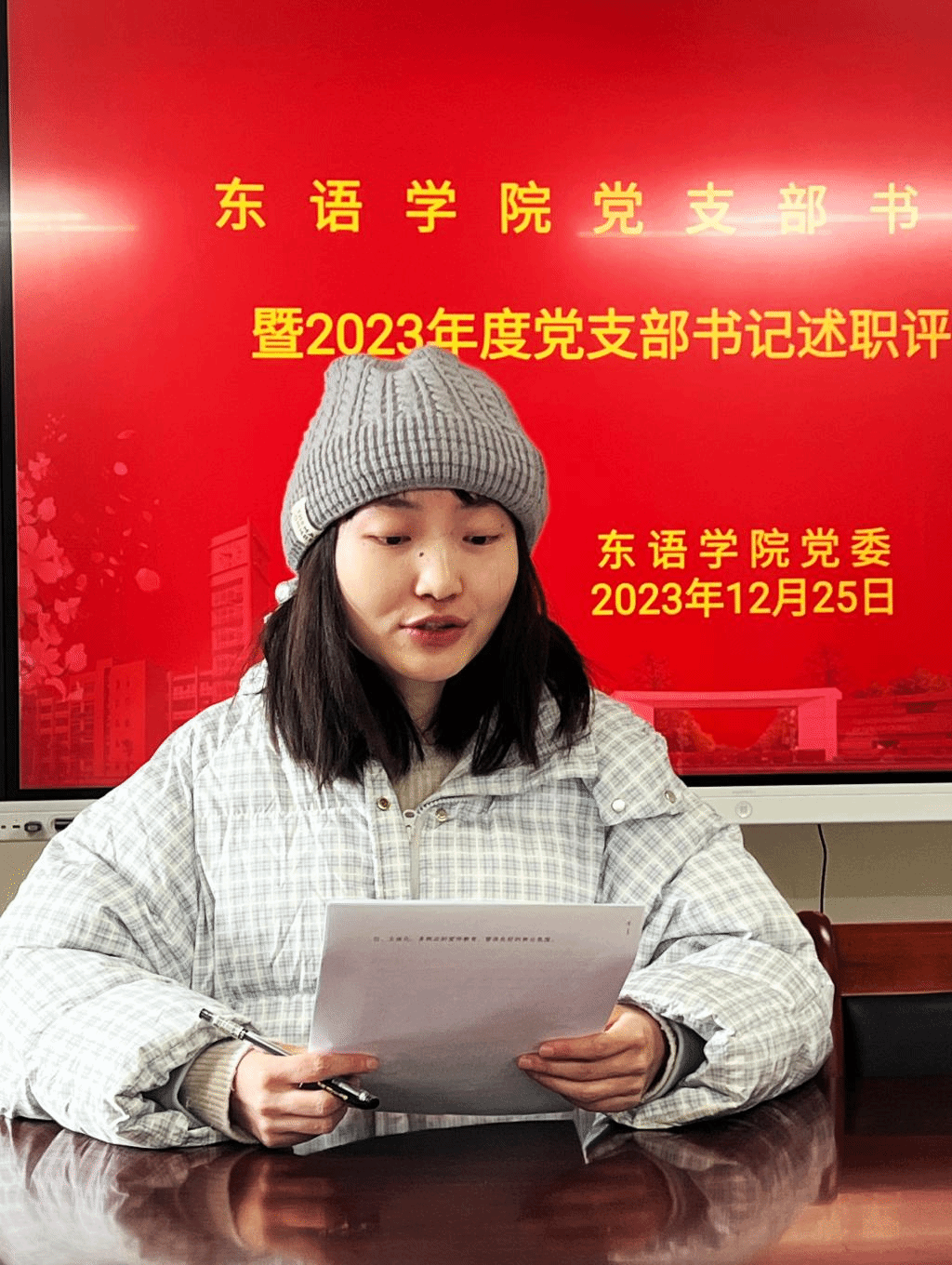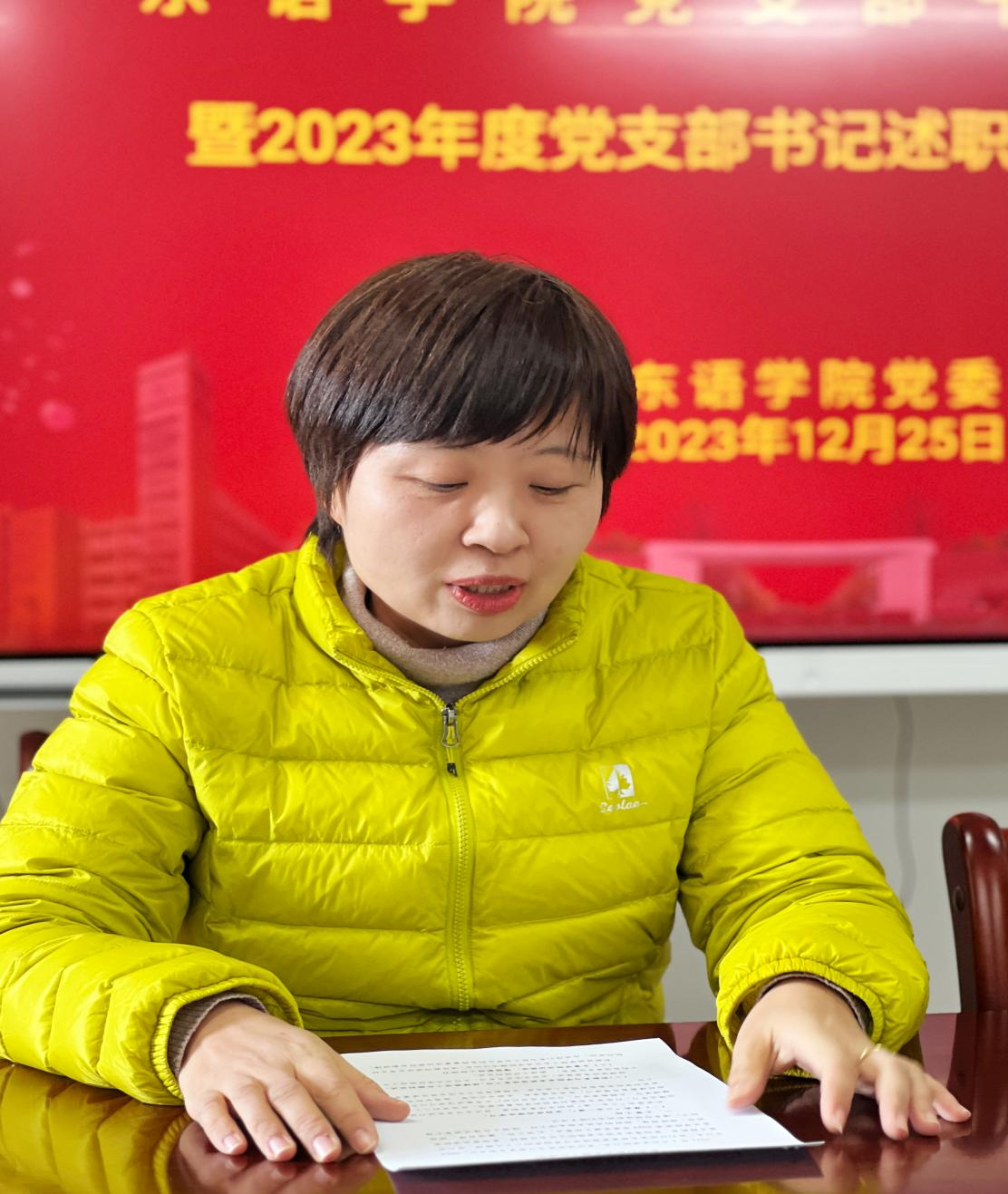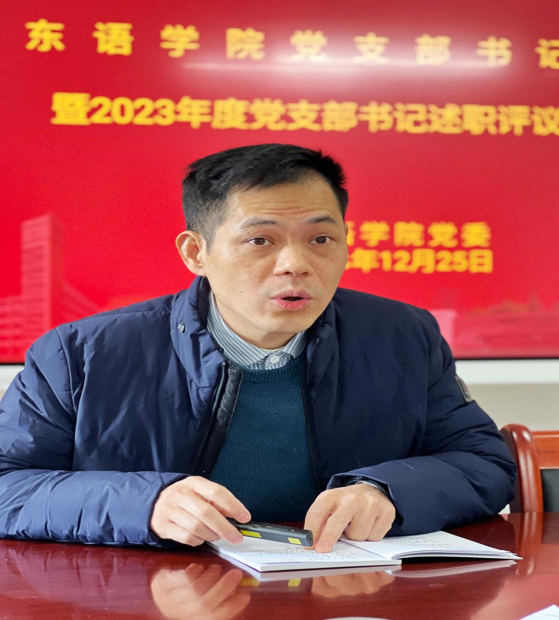 会议首先由各党支部书记逐个进行述职。教师党支部书记刘志强、印越柬缅学生党支部书记潘相宇、行政党支部书记刘晓霞、马泰老本科生与研究生党支部书记陈泠璇,重点围绕学习贯彻党的二十大精神、深入开展主题教育、贯彻落实全国全省组织工作会议精神、贯彻落实学校党委及学院党委2023年度党建工作要点、规范落实“三会一课”等组织生活制度、教育引导党员在学校各项工作中发挥先锋模范作用等方面,就本支部2023年度主要工作、存在问题及思路举措等进行述职。