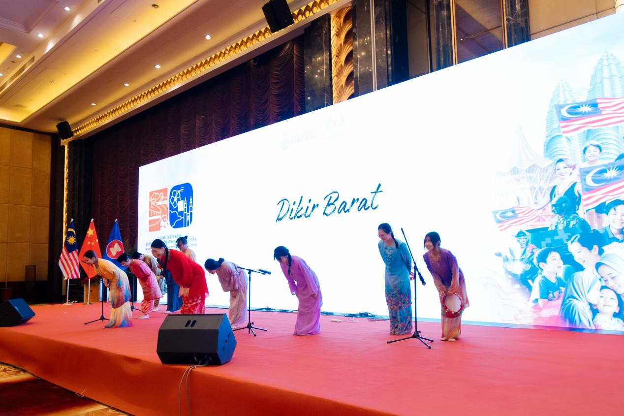 晚会活动现场氛围热烈。东语学院马来语系的学生们身着绚丽多彩的马来传统服饰,为在场嘉宾献上了精心准备的马来西亚传统歌舞表演——DIKIR BARAT。同学们以整齐划一的动作、悠扬动听的歌声,完美诠释了马来文化的独特魅力,赢得了在场嘉宾的阵阵掌声,充分展现了马来语专业学子们良好的精神风貌和专业素养。