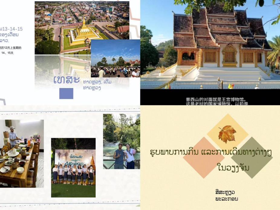 活动的首个环节是主题作品展示。老挝语专业2021级本科生结合留学的经历,围绕“我在老挝的故事”这一主题,通过现代化的Vlog、Powerpoint等形式,分享了在老挝学习与生活的体验。相关作品包括:“琅勃拉邦见闻”“过塔銮节”“在老挝印象深刻的事”“万象出行与饮食”等等。这些作品全部配有中文和老挝语双语,内容丰富而生动,充分展现了2021级学生在留学期间的收获与成长。