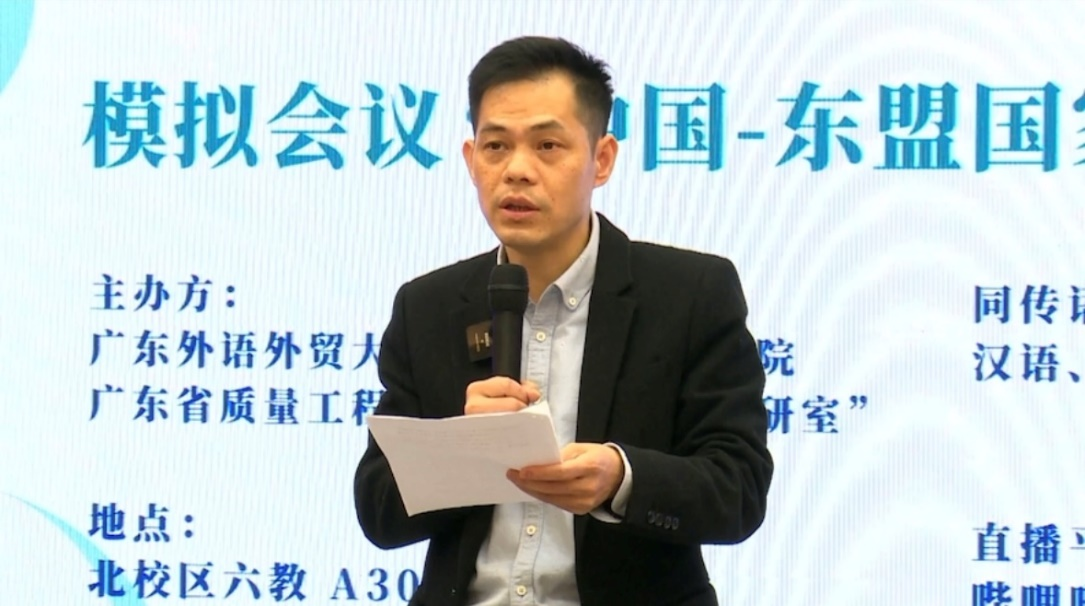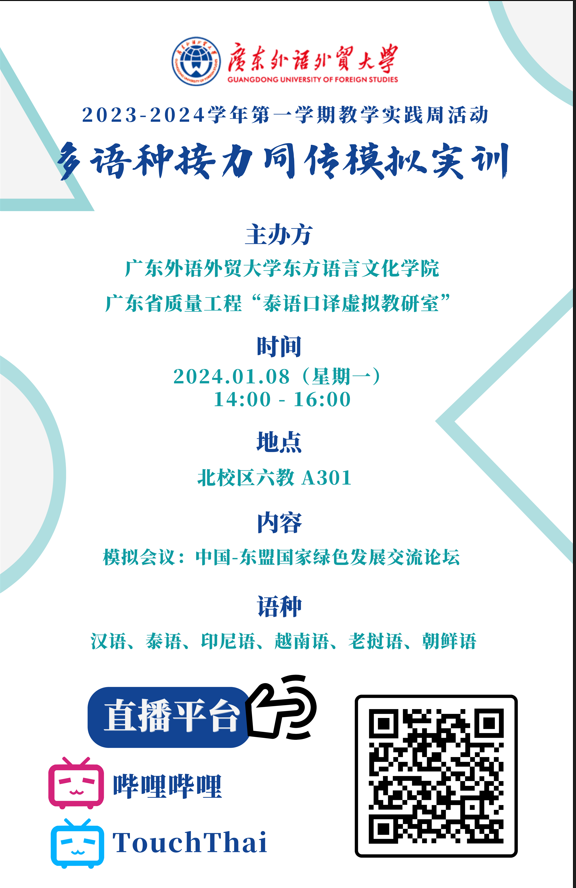“多语种接力同传模拟实训”,是广东外语外贸大学东语学院2023-2024学年度上学期教学实践周系列活动之一,也是2022年度广东省质量工程项目课程教研室“泰语口译虚拟教研室”策划的教研活动与实践教学观摩。该实训活动以“中国-东盟国家绿色发展交流论坛”为主题,通过模拟国际会议的形式,开展多语种接力实训,旨在通过 “多语种接力同传模拟实训”开展教学实践,使理论与实践相结合,在实践中检验学生的口译能力与口译教学效果,以便更好地改进口译教学,不断提高教学质量。
