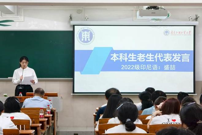 本科生老生代表、2022级印尼语专业盛喆同学以三句古语勉励新生:“合抱之木,生于毫末”强调语言学习需从基础积累、不怕挫折;“操千曲而后晓声”鼓励广泛实践、开拓视野,将语言转化为理解世界的钥匙;“苦尽甘来终有时”寄语大家在跨文化能力和开放心态中定位人生,勇敢奔赴山海,不负热爱、踏实成长。