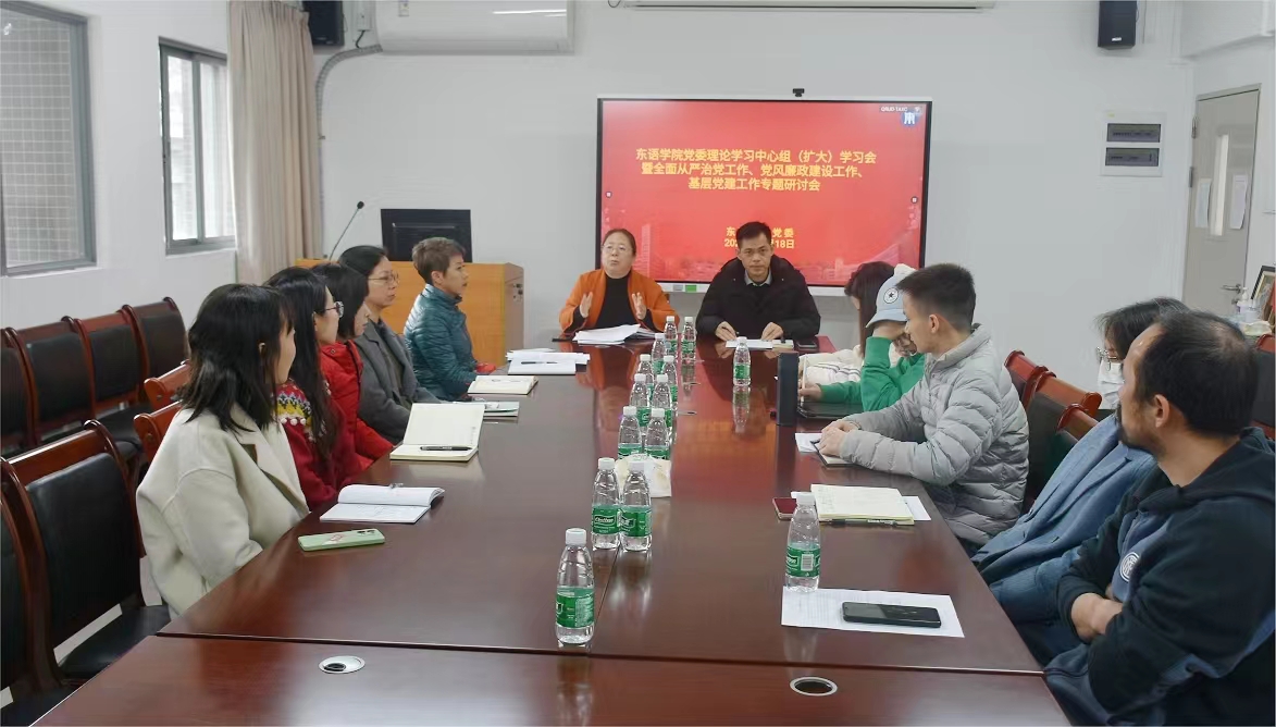 本网讯 2023年12月18日下午,东语学院党委召开中心组(扩大)学习会暨全面从严治党工作、党风廉政建设工作、基层党建工作专题研讨会。学院党委委员、党政领导班子成员、党支部书记、系主任、办公室主任、组织员等参会,会议由郝建萍书记主持。