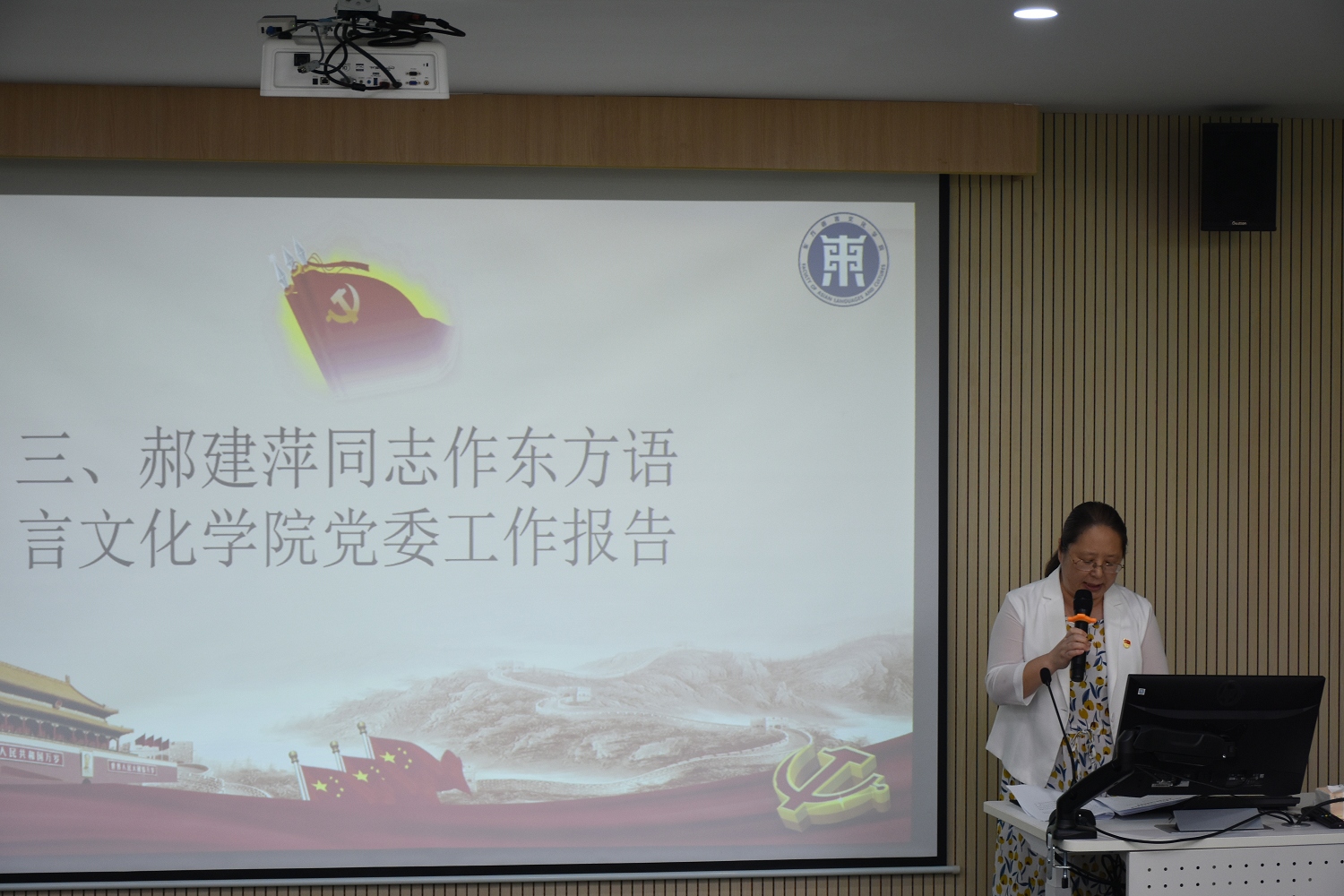大会在庄严的国歌声中拉开帷幕。学院党委书记郝建萍代表学院像大会作题为“勇担当,善作为,为学院高质量发展提供坚强有力的组织保证”的工作报告。报告全面回顾了学院四年来在党建思政、学科建设、科研与社会服务、国际交流与合作等方面取得的成绩。在总结成绩经验的同时,也指出学院发展中存在的欠缺与不足。提出了未来四年学院发展的主要目标和工作思路。报告指出要全面加强党的建设,推进党建思政工作高质量发展,要全力提升学院工作发展内涵,从学科建设、师资队伍、人才培养、科研与社会服务、国际交流与合作等五个方面努力,全面推动学院高质量发展。
