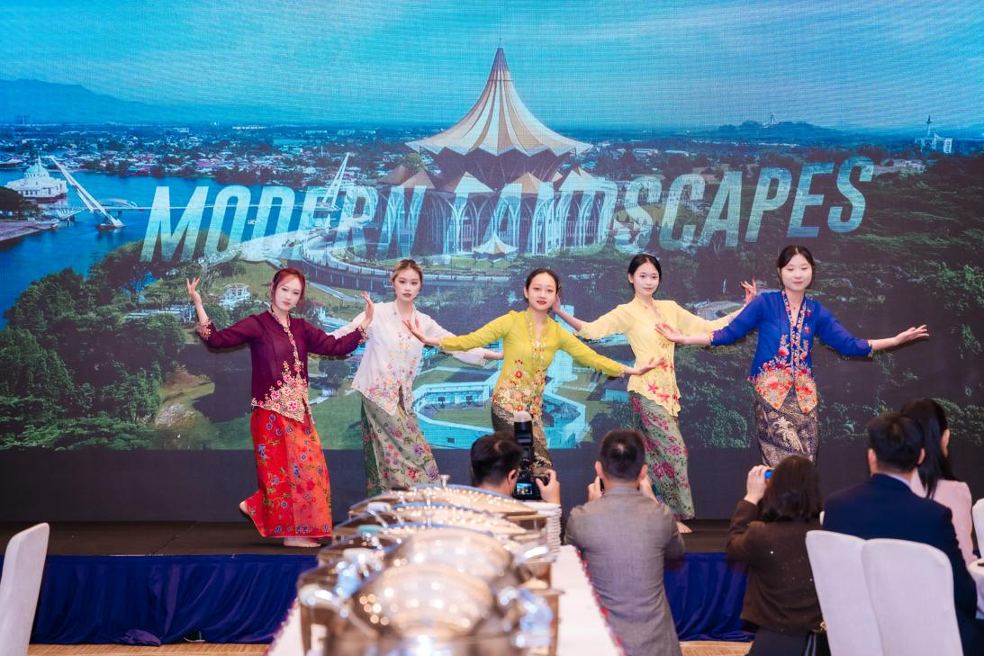 活动现场洋溢着浓郁的马来风情。色彩绚丽、工艺精美的马来西亚传统服饰与巴迪蜡染布(batik)引人驻足,各式经典地道的马来西亚美食令人回味,充分展现了马来西亚多元文化的魅力。而我院马来语专业学生带来的精彩表演,更是将现场气氛推向了高潮。同学们身着鲜艳精美的娘惹服饰(Baju Kebaya),为在场嘉宾呈现了精心排练的马来西亚传统舞蹈Inang。柔美的舞姿、灿烂的笑容、流畅的队形变换,赢得了现场阵阵掌声,生动展示了我院马来语专业学生良好的精神风貌与专业素养。