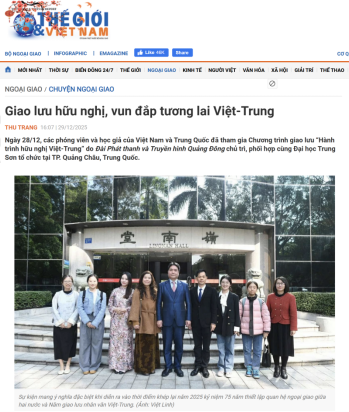 2025“中越友好采风行”在中越建交75周年暨“中越人文交流年”框架下开展,旨在通过媒体走访与对话交流,增进两国人民相互理解,推动中越关系持续健康发展。活动期间,刘志强教授代表我院向越南代表团赠送图书,作为中越知识共享与友谊延续的见证。本次交流会是“中越友好采风行”的收官活动,得到越南主流媒体报道,并开启了双方新闻合作的新阶段。