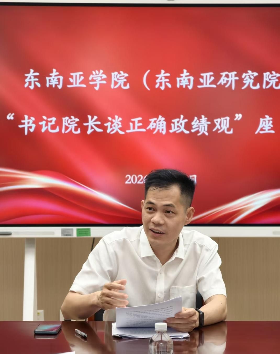 刘志强指出,正确的政绩观是学院事业发展的“方向标”和“压舱石”。面对“十五五”规划开局之年的新形势新任务,要把树立和践行正确政绩观融入学院办学治院的各方面、全过程,团结带领全院师生,以更加务实的作风、更加昂扬的斗志,推动东南亚学院高质量发展再上新台阶,为服务“一带一路”建设和中国—东盟命运共同体建设作出新的更大贡献。