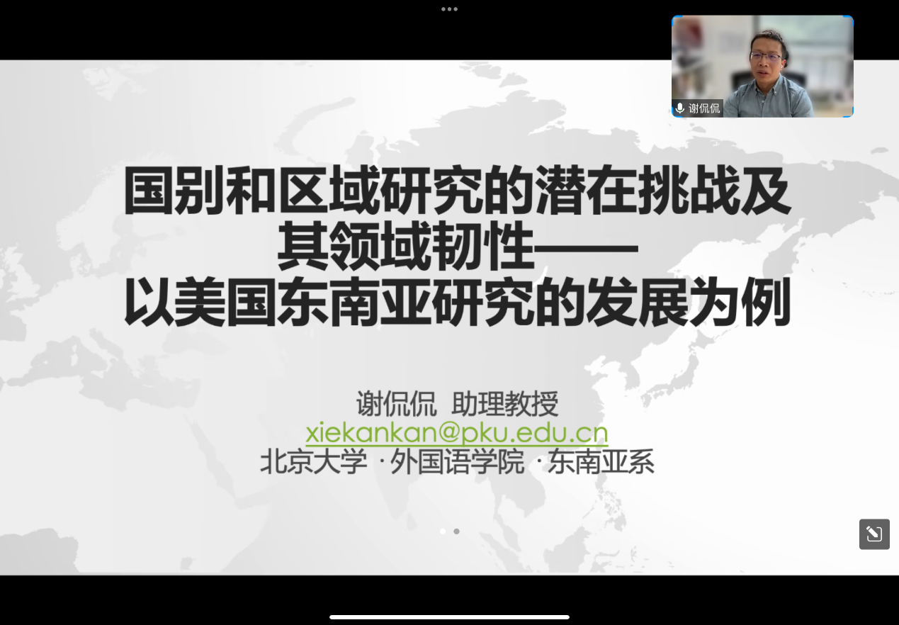谢侃侃助理教授首先指出,在建设具有中国特色 区域国别研究的过程中,二战以来美国区域研究的发展历程备受中国学者的关注,将其经验视作中国发展区域国别研究的重要参考。随后,以东南亚研究为例,他从美国区域研究的战前学科基础、东南亚研究中心的创立、遭遇危机、康纳尔模式、东南亚研究的发展趋势、研究转向以及经验启示等7个方面深入浅出地探讨美国区域研究自20世纪70年代中期以来遭遇的多重危机,以及该领域如何在变化的历史条件下进行适时调整,找到其在学界内外的相关性、存在合理性,源源不断地获取新的发展动力。