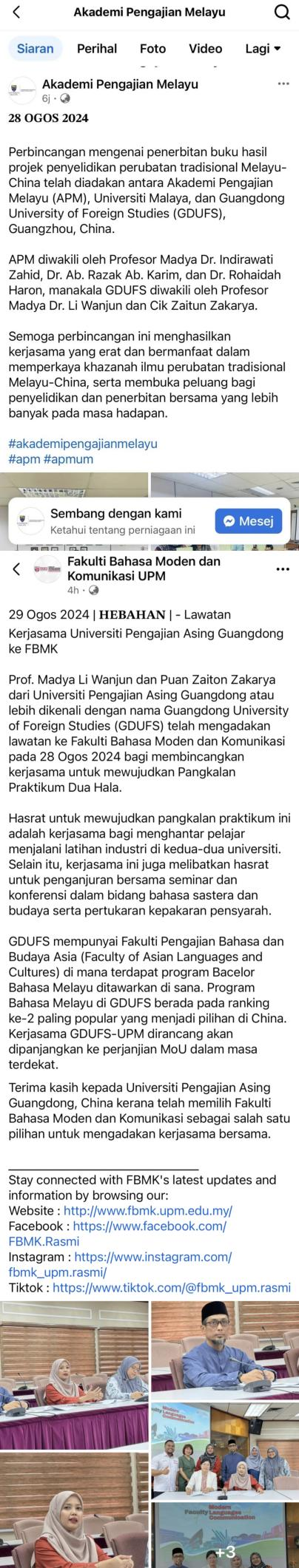 马来亚大学及马来西亚博特拉大学官方社交媒体账号对广外代表团来访的报道