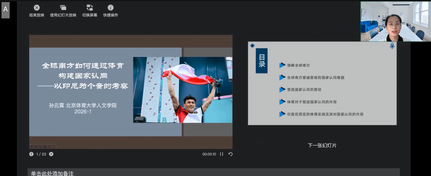 讲座中,孙云霄老师围绕全球南方国家认同建构这一核心议题,系统阐述了理解全球南方、国家认同面临的普遍难题、认同塑造路径、体育在认同构建中的独特作用,并结合印度尼西亚的具体体育实践,深入剖析了体育如何成为凝聚国家认同、传递文化价值的重要载体。