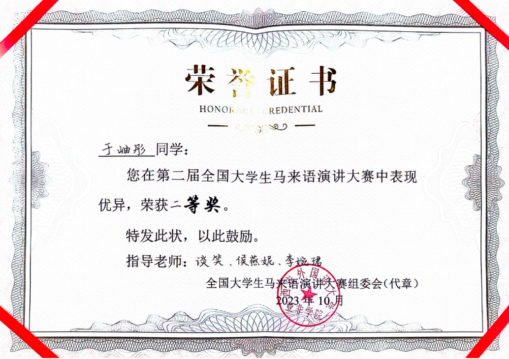 本网讯 10月28日至29日,2023年第四届中国-马来西亚翻译、语言与文化国际研讨会暨第二届全国大学生马来语演讲大赛在西安外国语大学举行。我校东语学院马来语系本科生马晓格、戴怡馨分别获高年级组一、二等奖,于岫彤荣获低年级组二等奖。谈笑、李婉珺、侯燕妮三位老师获得优秀指导教师奖。