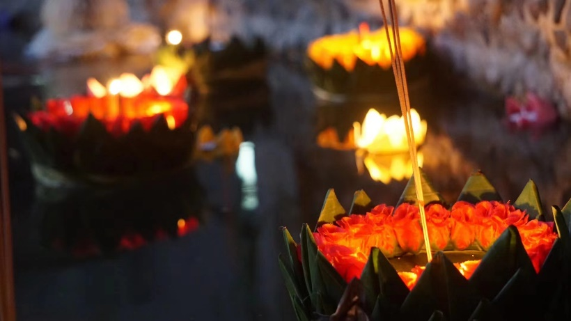 活动后,大家一起来到八教前的池塘边,手捧点燃后的水灯,将其放在水面上,一盏盏水灯载着无数的祝福和希望,为中泰师生送去美好祝福。