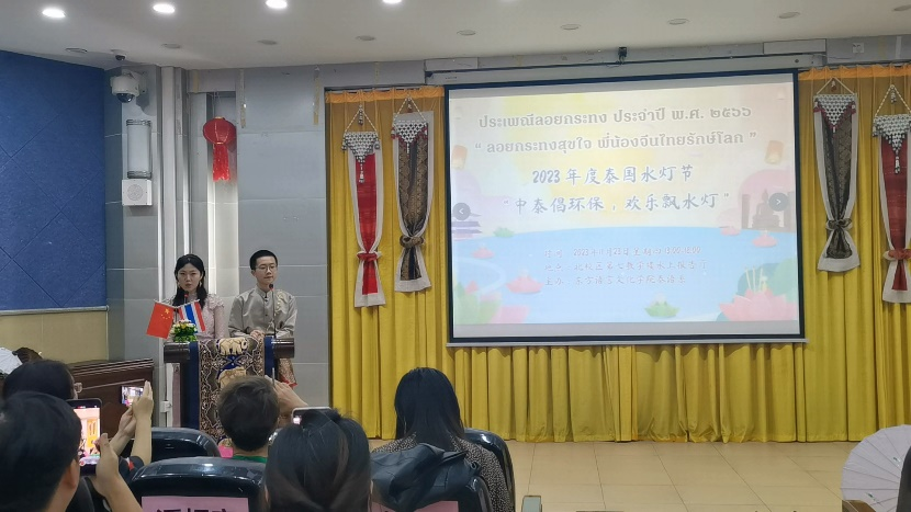 本网讯 2023年11月23日下午,由广东外语外贸大学东方语言文化学院主办,泰语系承办的2023年度泰国水灯节活动——“中泰倡环保,欢乐漂水灯”在北校区七教水上报告厅举行。泰王国驻广州领事馆副总领事常佩瑶、泰王国驻广州领事馆领事林悦文、广东外语外贸大学国际交流合作部(港澳台事务工作部)副部长陆露以及东方语言文化学院党委副书记潘相宇出席了本次活动。活动吸引了东语学院泰语系师生及留学生教育学院的泰国留学生共计50余人参加。