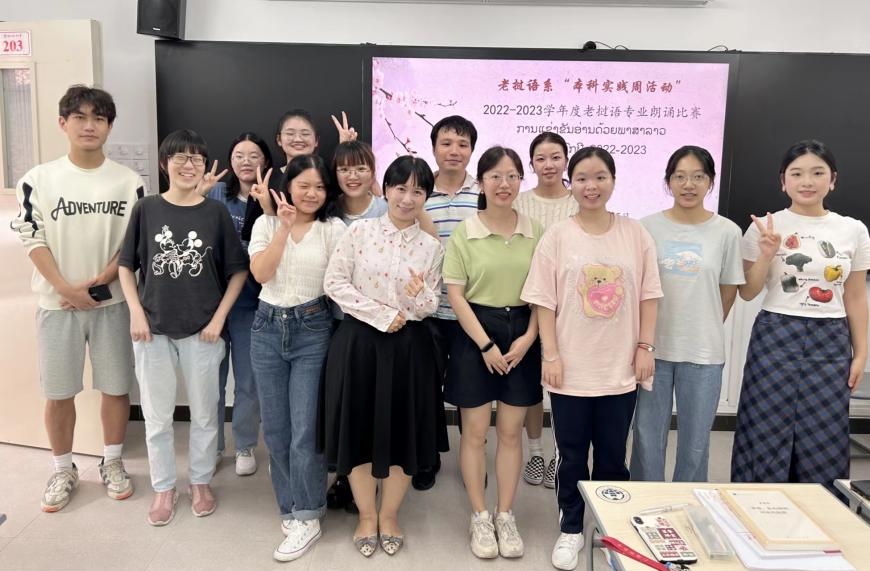本网讯 2023年6月25日下午,东语学院老挝语系在一教南楼203课室举办了“2022—2023学年度老挝语专业朗诵比赛”。老挝语系教师武智、谢泽鑫、罗雪瑜以及21级本科生参加了活动。