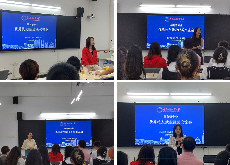 本次就业经验分享交流会邀请到了缅甸语系14级的四位师姐,分别是刘衍希师姐、吴嘉怡师姐、廖细惠师姐和刘芷珊师姐,四位师姐分别详细地介绍了自己专业学习,以及工作以来的相关经验。如:吴嘉怡师姐分享了在中国银行(香港)工作的经验,刘衍希师姐介绍了跨专业考研并入职广州宝洁有限公司工作的经验,刘芷珊师姐着重介绍了入职国企并外派缅甸工作的经验,廖细惠师姐则分享了考取公务员从事公安工作的经验。此外,四位师姐也和大家分享了当初临近毕业,各自对未来就业规划的心路历程以及就业后在工作领域遇到的困难和挑战。