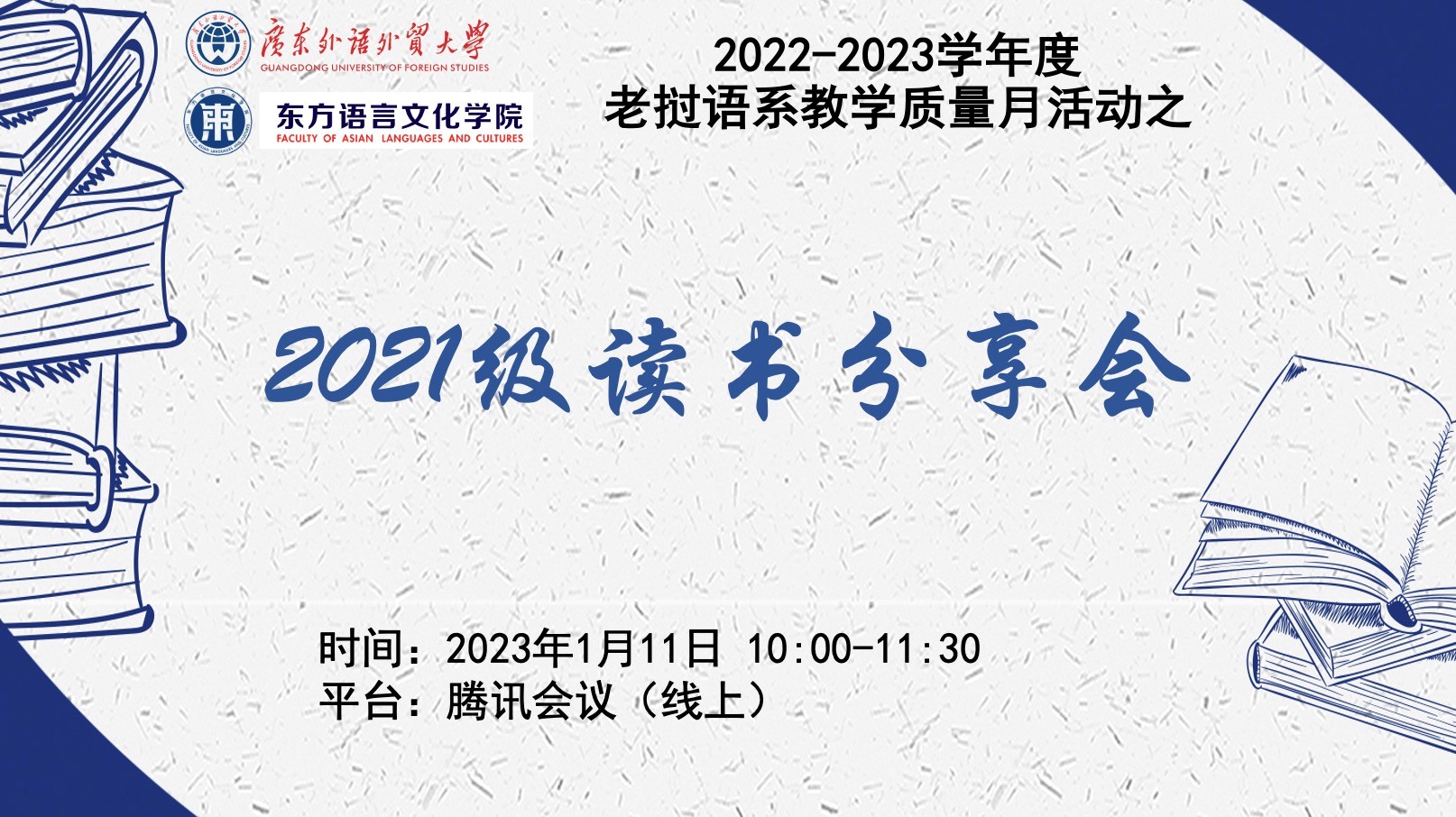 本网讯 2023年1月11日上午,由广东外语外贸大学东方语言文化学院老挝语系主办的“2021级老挝语专业读书分享会”在线上举行。本次活动由老挝语系罗雪瑜老师主持,武智老师、刘颖君老师、谢泽鑫老师和老挝语专业2021级学生参加。
