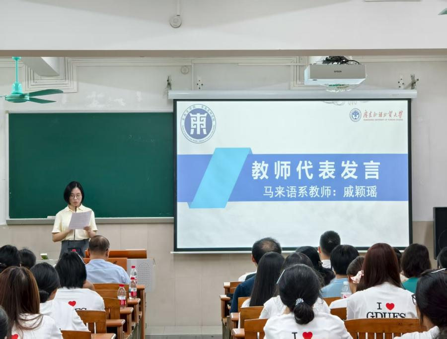 随后,马来语系教师戚颖瑶以马来谚语“tak kenal, tak cinta”(因为了解,所以热爱)为核心,从专业学习、人际交往、社会实践和自我探索四个方面,鼓励新生以开放心态和持续行动去认识、理解并真正热爱所学专业、所在环境及自身潜能,强调热爱源于持续的积累与真诚的体验,寄语新生在了解与实践中扎根专业、坚定成长。