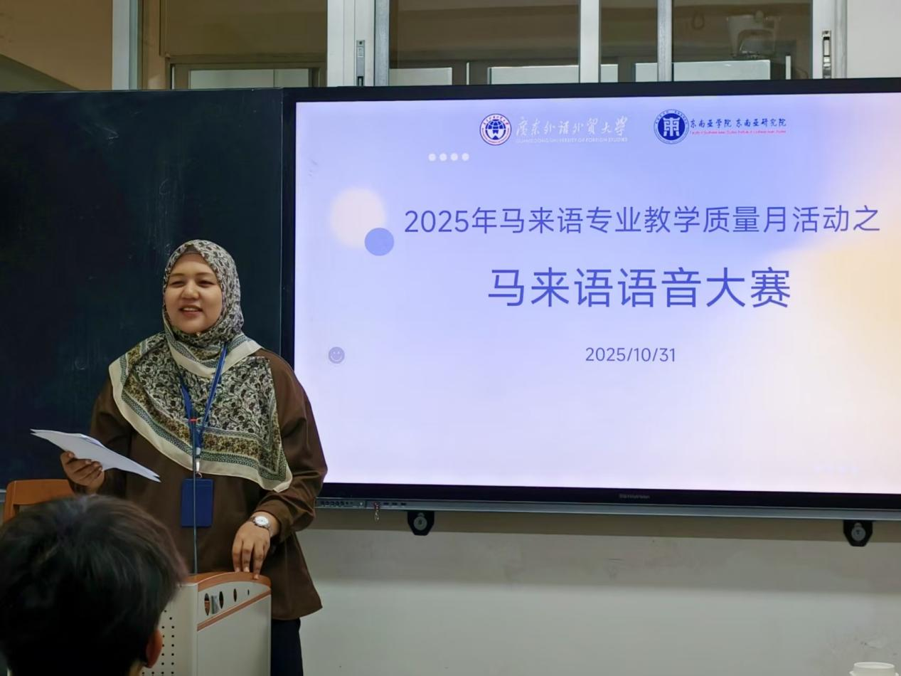 本网讯 为深入贯彻“五育并举”人才培养理念,加快构建复合型、创新型、国际化人才培养体系,积极响应学校第十九届“本科教学质量月”活动号召,东南亚学院(东南亚研究院)马来语专业于2025年10月31日举办2025级新生马来语语音大赛。本次活动由戚颖瑶老师与扎伊顿老师担任评委,全体新生踊跃参与,展现出良好的学习风貌。