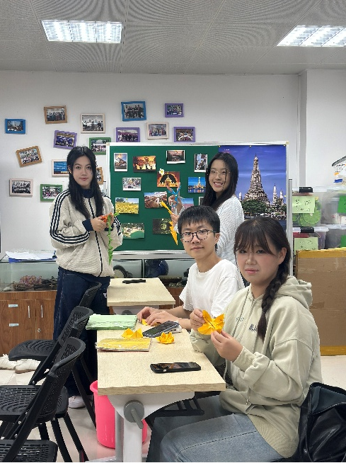 课堂的最后阶段,苏瓦幸福老师配合视频详细讲解了纸水灯的制作方法。先拿正方形纸张沿中线对折出弧度,再一步一步将边缘交错固定,做成能承载鲜花与烛火的“水灯”,每一个折痕都讲究对称与稳固,暗含“承托美好”的寓意。大一、大二的同学们跟着视频认真学习折法,互相交流技巧,在动手实践的乐趣中,近距离感受泰国传统手工艺的精巧与温度,更深刻体会到水灯“以物寄情”的文化内涵。最后大家都纷纷合影展示自己制作的纸水灯作品,成为本次文化课堂最鲜活的文化实践成果。