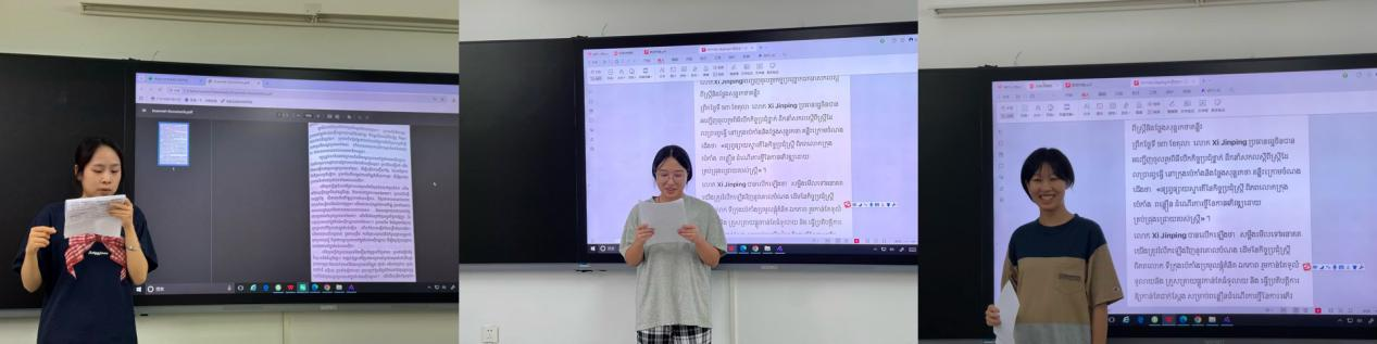 比赛过程中,选手们精神饱满,朗诵情感真挚,感染了在场的所有老师和同学。韦昭燕同学以流畅的柬埔寨语表达中国十分重视与周边国家的往来,苏羽萱同学用温情的语调表达中柬在民生领域的合作共识,柯虹悦、卯婵等同学用铿锵有力的柬埔寨语表达中国应对全球气候问题的责任与担当。选手们凭借扎实的语言功底,将理论思想学习与外语应用完美结合,赢得现场师生阵阵掌声。