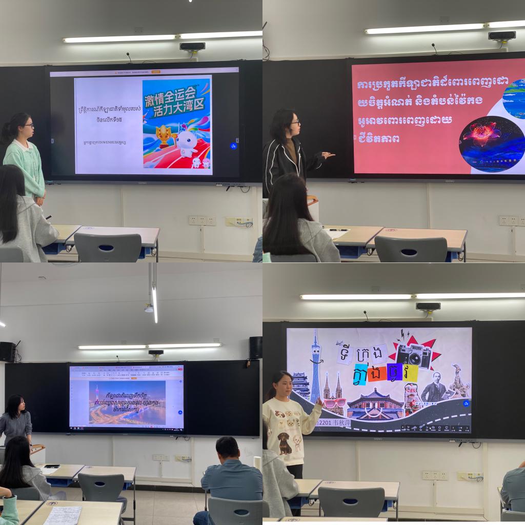 本网讯 2025年11月11日下午,柬埔寨语专业2201班举办了以“激情全运会,活力大湾区”为主题的柬埔寨语演讲比赛。本次比赛由柬埔寨语系周惠雯老师主持,并特邀柬埔寨语外籍教师王虎老师莅临指导与点评,旨在全面检验柬埔寨语专业2022级学生的语言应用能力,锻炼学生的公开演讲能力、临场应变能力和文献检索能力。