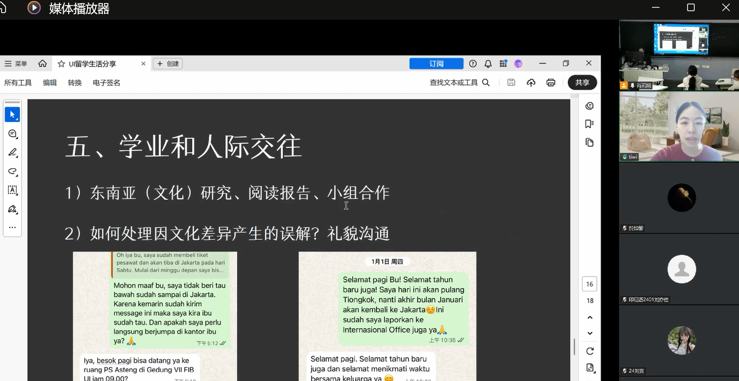 本网讯 1月14日上午,我院印尼语系成功举办了教学实践周系列活动之“印尼大学读研经验分享会”。本次分享会特邀目前正在印尼顶尖高校——印度尼西亚大学(Universitas Indonesia)攻读东南亚研究方向硕士学位的2025届校友陈然,通过线上形式与师弟师妹们进行深入交流。