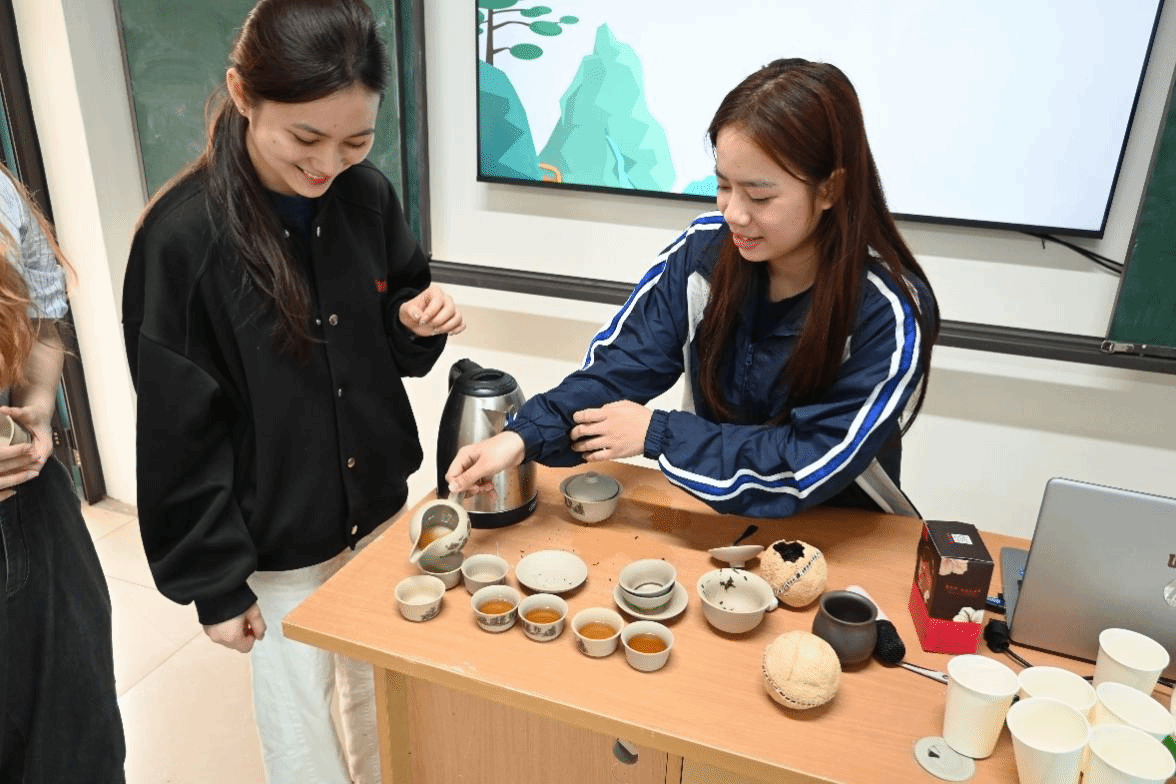 在文化分享环节,中国学生刘晓芸同学首先介绍了蒲坑茶的历史渊源、感官特点与发展现状。这款产自广东清远石潭镇的茶叶,在百余年传承中形成了入口微苦、回味甘甜的独特风味,却依然面临品牌知名度有待提升等现实困境。她特别提到非遗传承人陈汝斌先生——这位原本学医的青年选择回乡继承父辈制茶事业,在无数次失败与坚持中将手艺传承下来。“制茶如修心,需以耐心守工序,凭坚守待回甘。”这番话让在场师生真切感受到每一杯茶背后都是代代茶人的坚守。