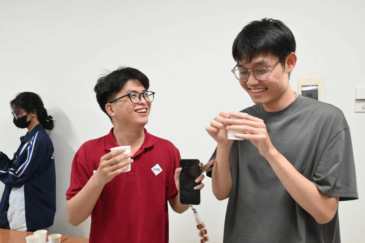 交流之后是沉浸的体验环节。“清谷溯梦”团队成员演示蒲坑茶冲泡流程,随后两名越南学生在指导下亲手尝试冲泡。“第一次接触蒲坑茶,入口微苦,回味却很甘甜,很有意思。”一位参与体验的越南学生感慨道。品茶交流环节,中越学生围坐一堂,共品蒲坑茶,畅谈感受,茶香中流淌着真诚的交流与真挚的情谊。