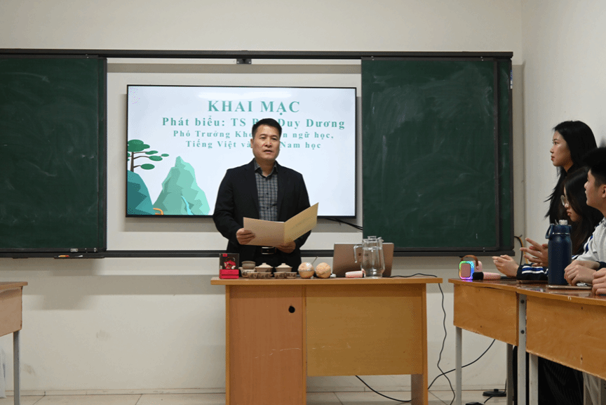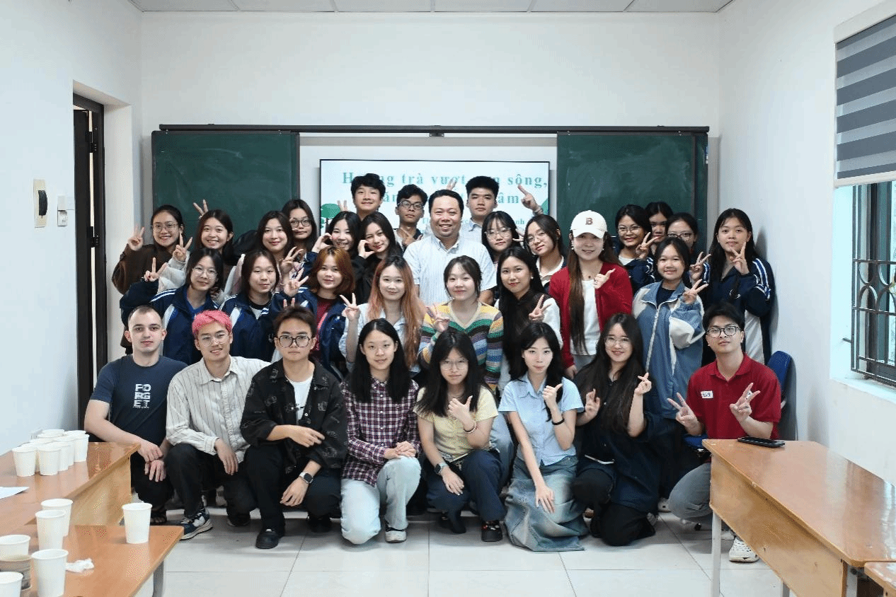 本网讯 2026年3月19日,广东外语外贸大学东南亚学院“百千万工程”突击队“清谷溯梦”团队在越南河内国家大学下属人文社科大学举办“香越山海,文化结知音”蒲坑茶文化交流活动。团队负责人刘晓芸和王可等8名中国留学生,与1名乌克兰留学生、河内人文社科大学语言学、越南学与越南语系及东方学系中国学专业的18名师生齐聚一堂,以茶为媒,在影像、对话与亲身体验中,共同走进蒲坑茶的“三生”世界。河内人文社科大学语言学、越南学与越南语系副主任裴维阳(Bùi Duy Dương)博士与2025级中国政府公派留学互换班班主任武明海(Vũ Minh Hải)博士出席活动并发表讲话。此次活动是“清谷溯梦”团队将调研成果转化为海外传播实践的重要一步,也是蒲坑茶“第三次生命”在异国土壤中的一次生动绽放。