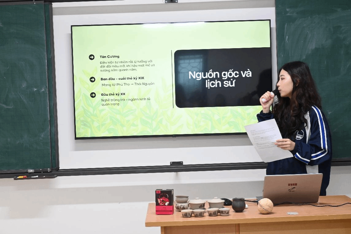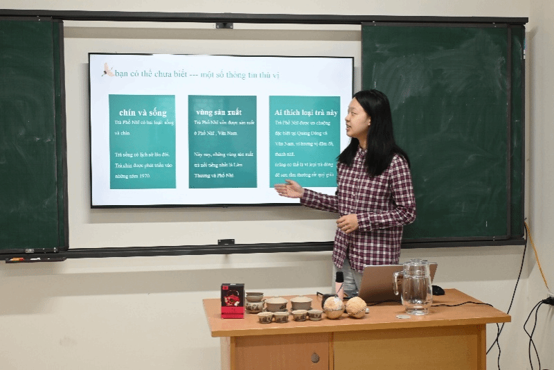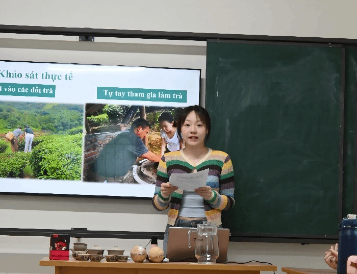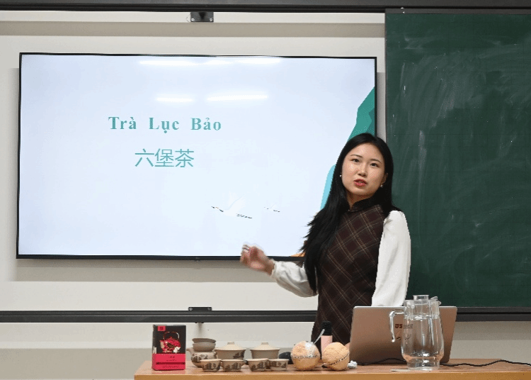 团队成员介绍蒲坑茶随后,中国留学生谢雯枝同学与胡楚湉同学分别介绍了中国的六堡茶与普洱茶。她们讲到,六堡茶以“红、浓、陈、醇”著称,是广西梧州的瑰宝,历史上更曾沿西江、下南洋,成为华人华侨思乡的寄托;普洱茶则以其越陈越香的特性闻名,在岁月的沉淀中不断转化升华,被誉为“可以喝的古董”。两款名茶的介绍,让越南师生对中国茶文化的博大精深有了更为立体的认识。